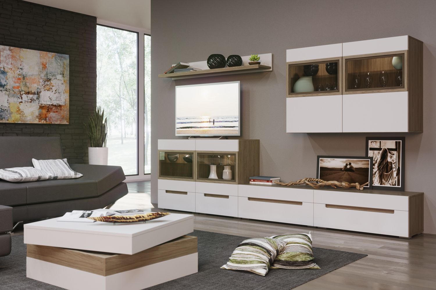 - Гостиная в современном минималистичном стиле. Такая мебель универсальна и подойдет интерьерам в стилях эко, скандинавский, минимализм и лофт (в его более «легком» варианте);