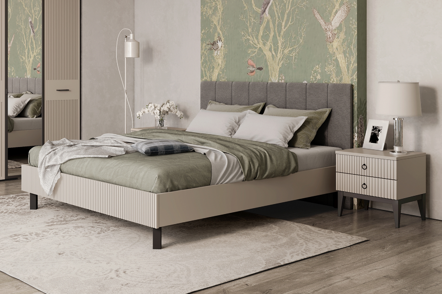 - Мягкое изголовье кровати выполнено в строгом геометрическом стиле и обито тканью приятного серого оттенка, гармонично сочетающегося с общим цветовым решением коллекции.