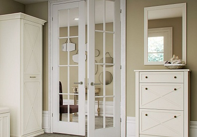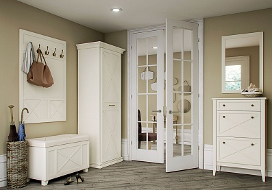 Вместительная функциональная мебель в стильном светлом оттенке подойдет для оснащения личного кабинета в стиле кантри, прованс или классика. В объемных застекленных шкафах можно разместить домашнюю библиотеку и документы, а добротный стол с выдвижными ящиками обеспечит необходимую рабочую атмосферу.