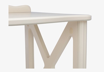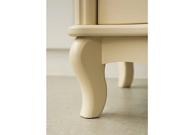 Столешница полукруглой формы выполнена из прочного, износостойкого МДФ, основание — из натуральной древесины. Лакированное глянцевое покрытие смотрится изысканно и благородно, фигурные ножки подчеркивают элегантность изделия. Широкий выдвижной ящик снабжен точечной круглой ручкой, декорированной «под золото».
